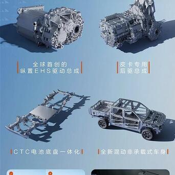 领有皮卡专用的后驱总成、CTC电板底盘一体化时间、全新混动非承载式车身,还配备了长行程双叉臂平稳悬架,电板包底部还配备了高强度贯注钢板,并领有智能电四驱和能量中锁。