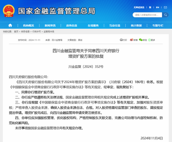 财联社11月11日讯(记者 彭科峰)11月11日上昼,国度金融监管总局官网线路,四川天府银行股份有限公司对于2024年增资扩股决议已获批准。