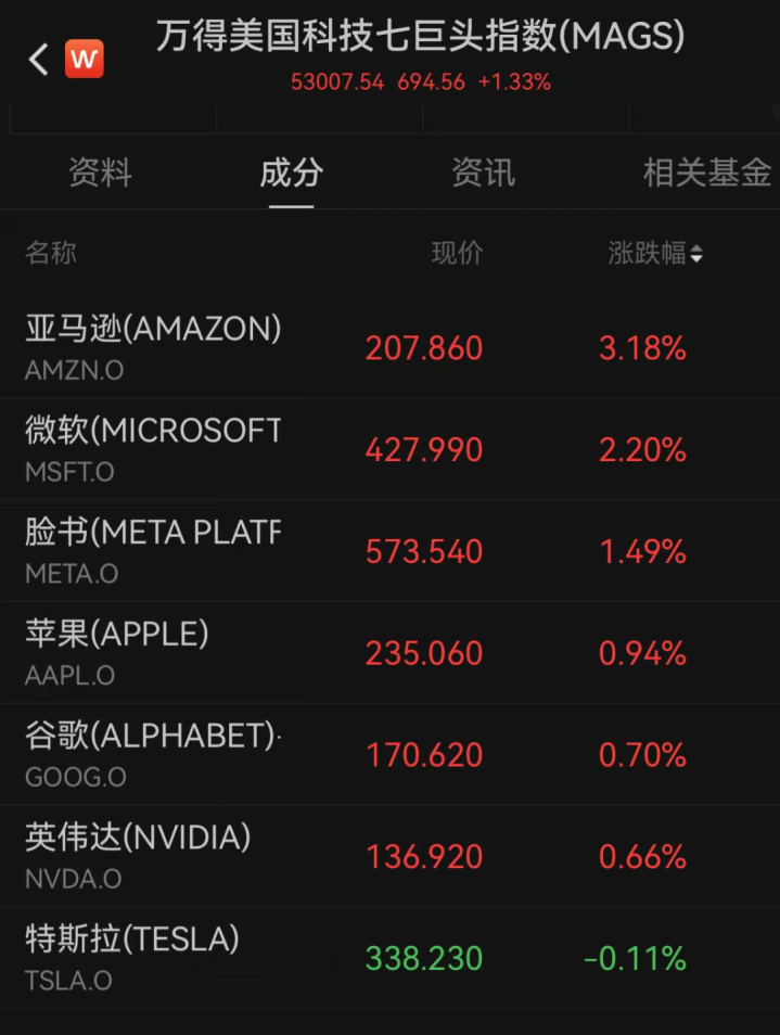 大型科技股多数高涨。Wind好意思国科技七巨头指数高涨1.33%,亚马逊高涨3.18%,微软高涨2.20%,META高涨1.49%,苹果高涨0.94%,谷歌-A高涨0.70%,英伟达高涨0.66%,特斯拉下降0.11%。