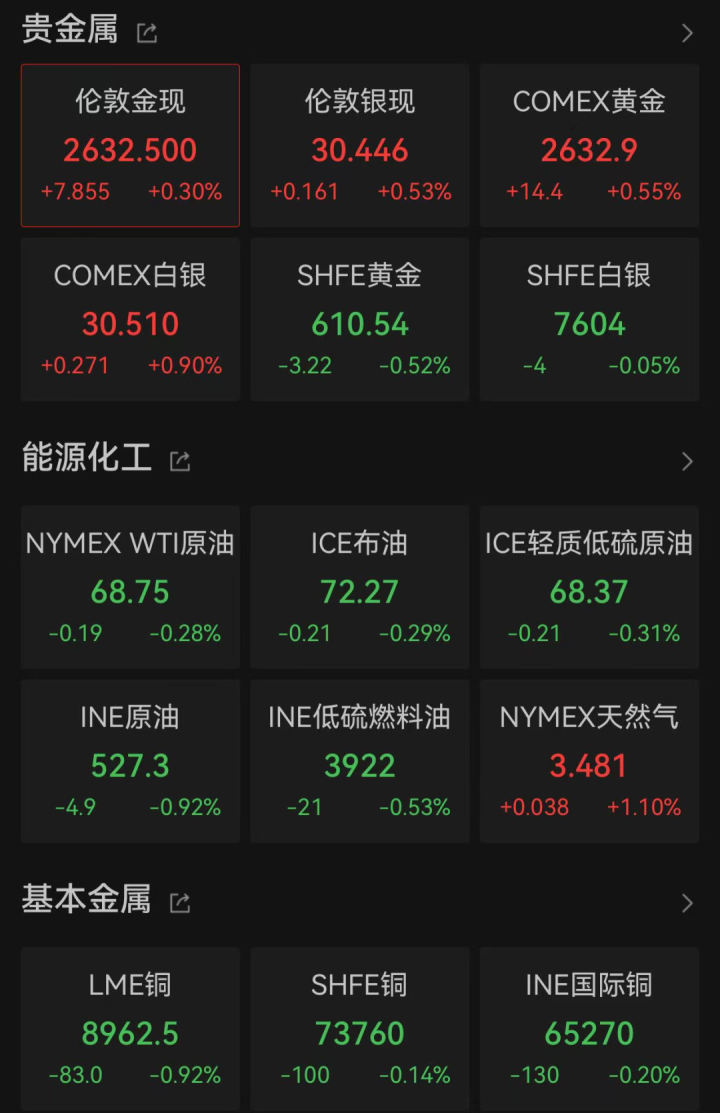 商品商场方面,现货黄金小幅反弹。畛域北京时辰5:53,现货黄金高涨0.30%,报2632.500好意思元/盎司,COMEX黄金期货高涨0.55%,报2632.9好意思元/盎司。