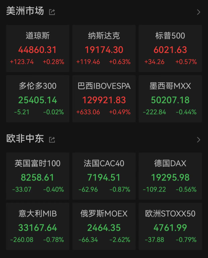 好意思股三大指数漂泊高涨。畛域收盘,说念琼斯工业指数高涨0.28%,纳斯达克指数高涨0.63%,标普500指数高涨0.57%。说念琼斯工业指数、标普500指数均创历史新高。