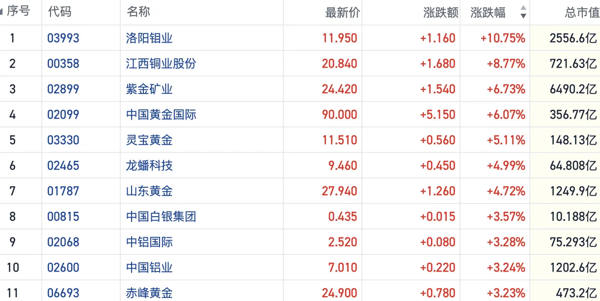 适度发稿,洛阳钼业(03993.HK)涨超10%,江西铜业股份(00358.HK)、紫金矿业(02899.HK)双双涨逾6%,山东黄金(01787.HK)等个股也解析跟涨。