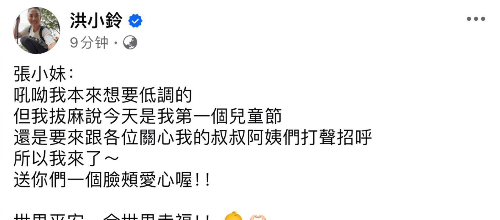 像片中,刚出身的小宝贝皮肤粉嫩,紧捏小拳的花样萌化世东说念主,而洪小铃虽素颜出镜,却难掩幸福笑貌。中年得女的洪小铃迫不及待心中承诺,以男儿“张小妹”口气发文:“要来跟诸位照料我的叔叔大姨们打声呼叫,是以我来了~送你们一个面颊爱心喔!!”