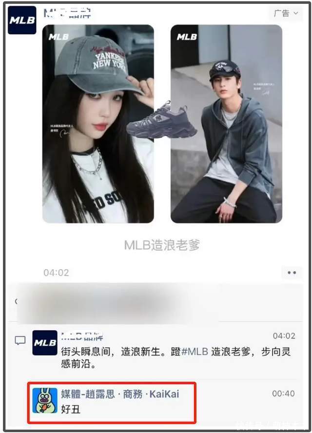 事情启事是,某博主晒出一又友圈告白截图,实践是某品牌发布了一则虞书欣的代言造型。但在这条规案下方,却出现了一个不和洽的驳斥,一个ID为“赵露念念商务”的东谈主在下面驳斥:好丑。
