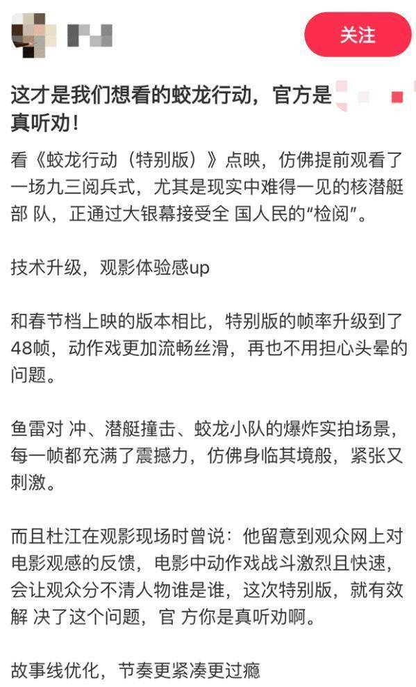 此次的《蛟龙行动(非常版)》到底非常在那边?直爽来说等于:片方之前说的“充分听取弘远不雅众提议”这句话,这一次是实打实地作念到了!