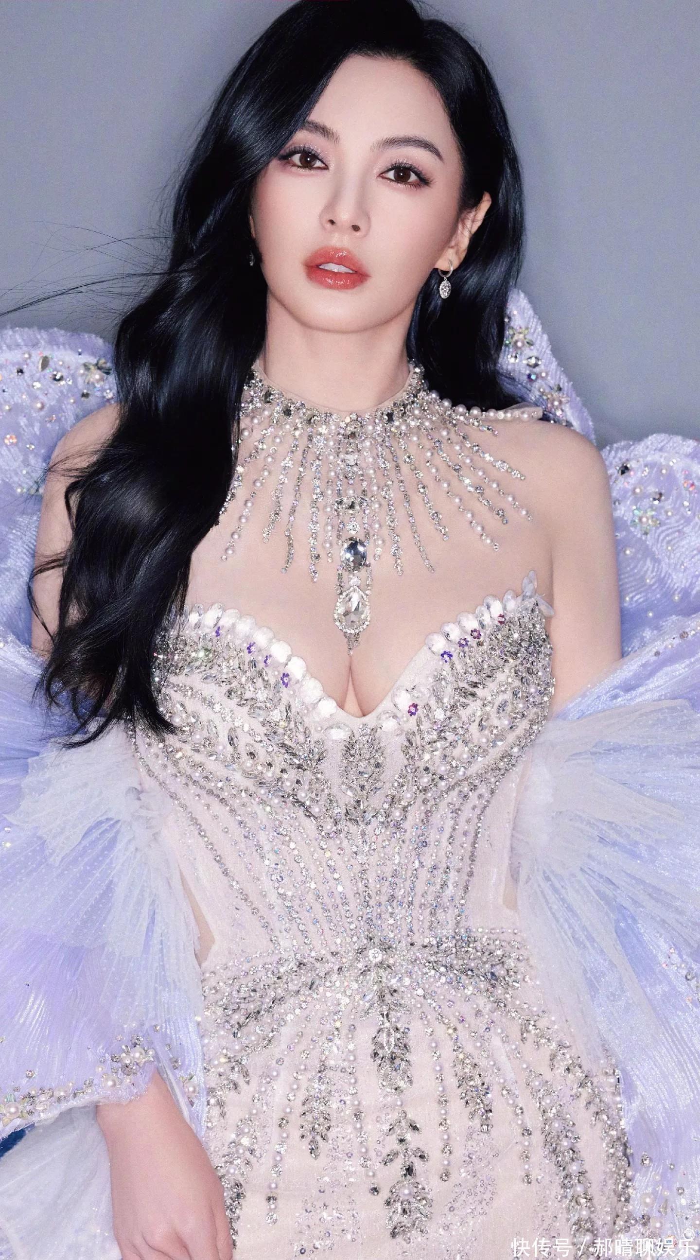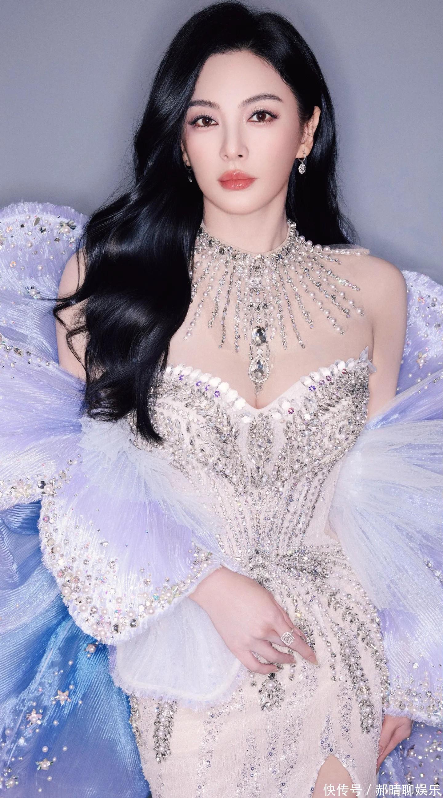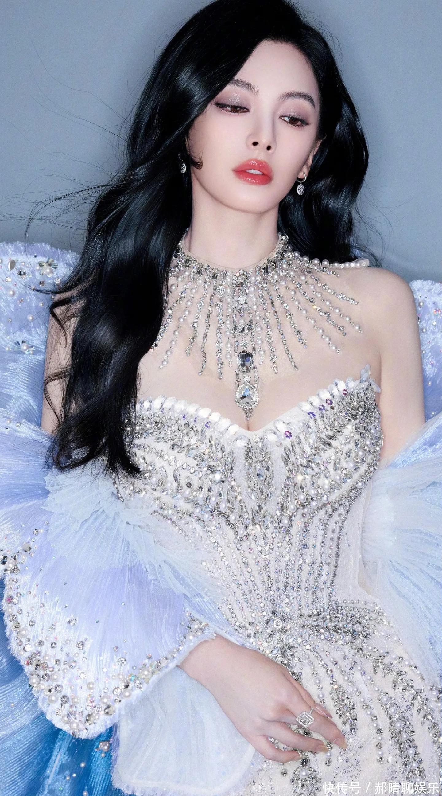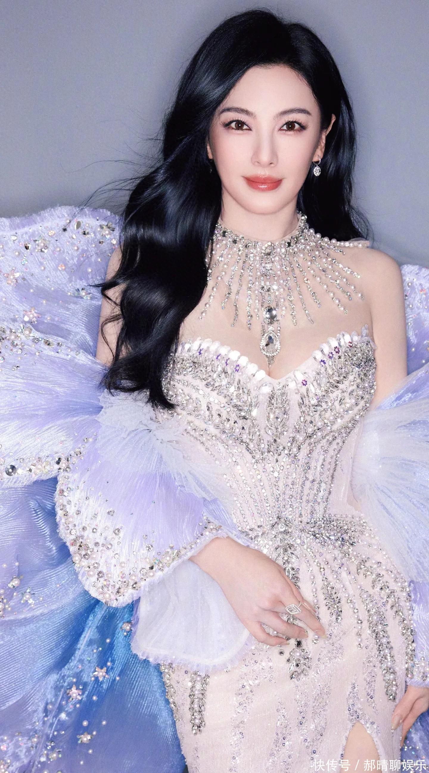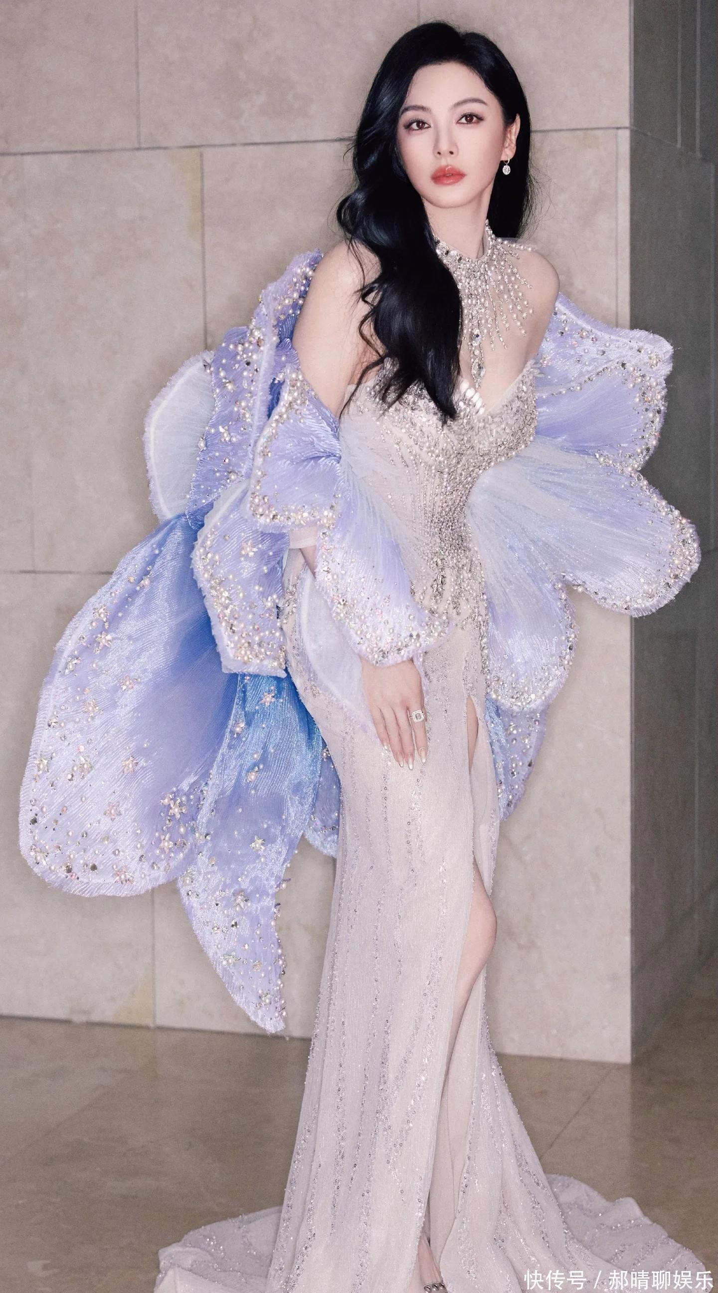 驯顺主体以蟾光白为底色,千万颗碎钻与珍珠如星子坠入星河,从胸衣膨大至裙摆,每一寸齐在光影里折射虚幻光晕;一侧开叉策动斗胆又优雅,将腿部线条衬得愈发修长;最绝的是那对渐变蓝紫的 “蝶翼” 披肩,薄如蝉翼的纱上缀满星光讳饰,既像蝴蝶振翅欲飞,又似星云在肩头流转。珍珠颈链与厚底高跟把丽都感拉满,却涓滴没压过她的气场 —— 仿佛 “丽都是铠甲,柔好意思是底色,弘远是内核”。