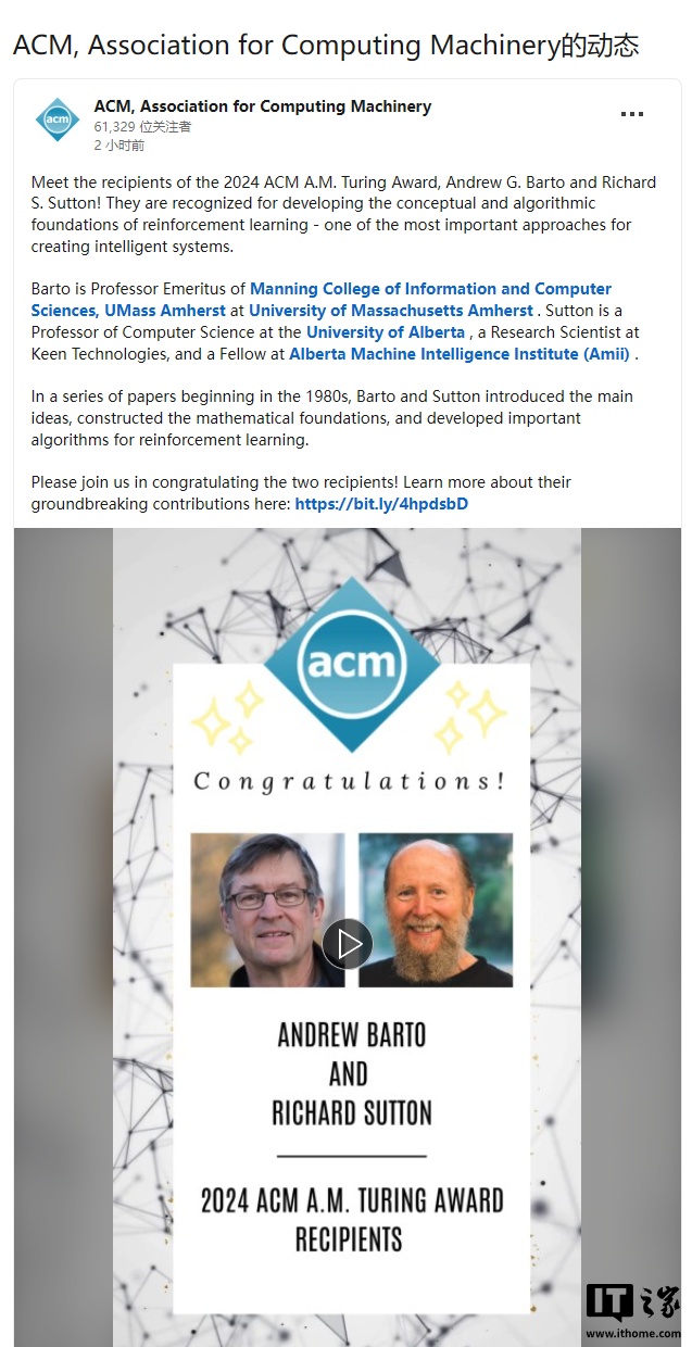图灵奖被誉为“测度机界的诺贝尔奖”,奖金高达 100 万好意思元(IT之家备注:现时约 726 万元东谈主民币),这次巴托和萨顿凭借开发“强化学习”本事而共同获奖。强化学习是一种通过试错覆按东谈主工智能系统作念出优化有贪图的机器学习身手。谷歌高等副总裁杰夫・迪恩(Jeff Dean)称这一本事是“东谈主工智能跳动的要道”,而况一直是推进东谈主工智能发展的“中枢因循”,包括 OpenAI 的 ChatGPT 和谷歌的 AlphaGo 等冲突性模子齐受益于此。