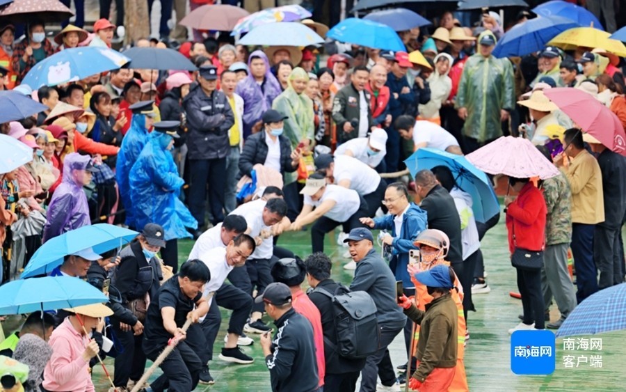 r而在冼夫东谈主文化广场的一侧,一场超燃拔河比赛正在进行。诚然这时下着丝丝细雨,但都莫得影响不雅众不雅赛的祥和。众人衣着雨衣,撑着伞,兴高采烈地不雅看比赛。