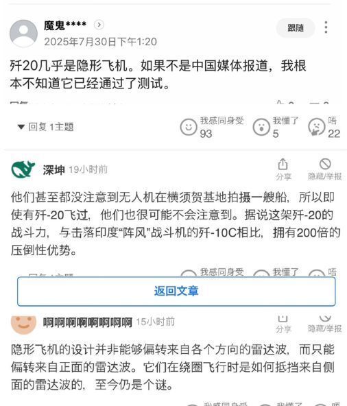 日本的论坛相通也很讶异,这件事可怕在什么场所呢?有日本网友示意,“歼-20确凿隐身,如果不是中国媒体报谈,咱们根底不知谈他们仍是通过了测试”“隐身飞机瞎想并非八成偏转来自各个角度的雷达波,只可偏转来自正面的雷达波,那它们在绕圈飘零的技艺,是如何偏转来自侧面的雷达波的,这于今是一个谜”。天然了,还有东谈主插嗫说雷达发现了,但仅仅没公布。以日本和韩国的调性,真淌若第一时分发现了,这不得淋漓尽致任意宣扬?日本航空自保队早升起合影去了,现时咱们主动报谈了才说我方早发现了,评释了什么?评释他们根底没发现。就跟台当局说用“火控雷达锁定了歼-20”一样,皆是一种赢学。