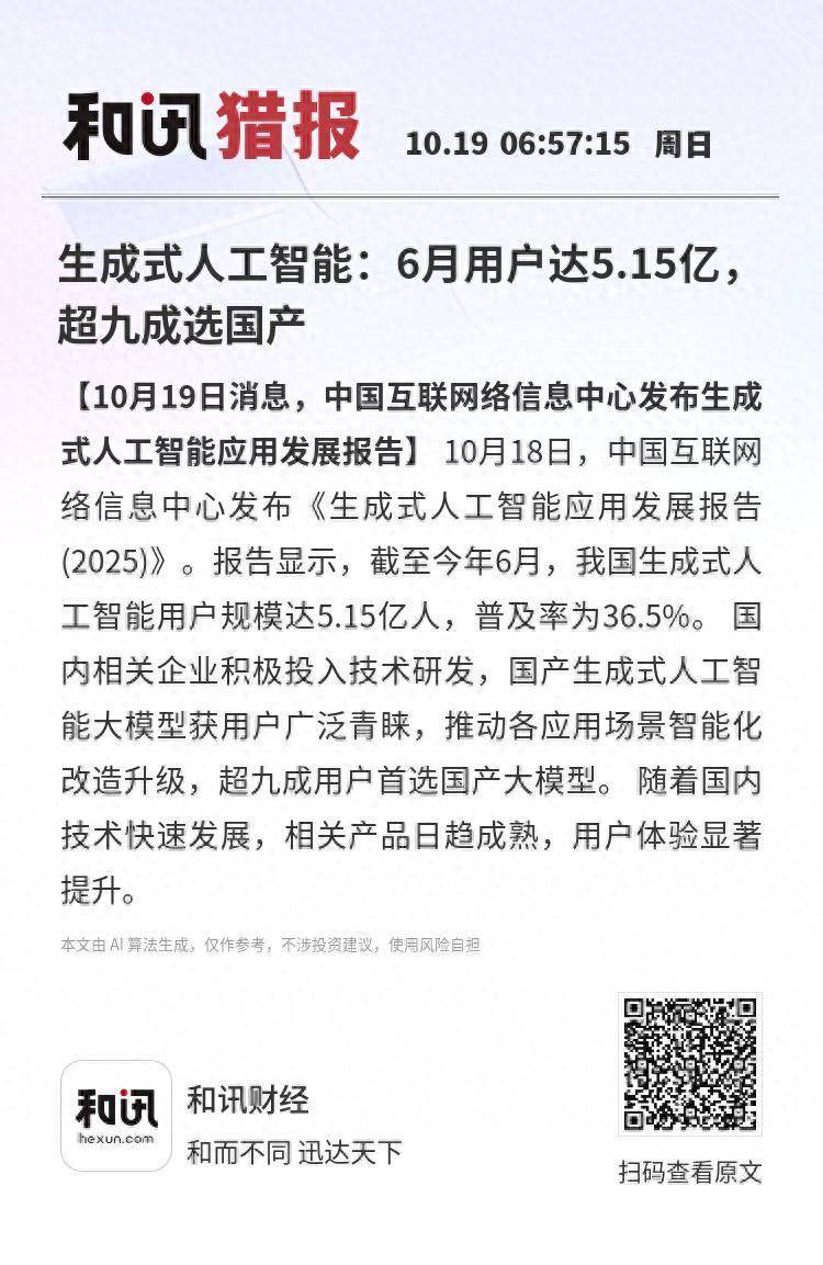 【10月19日音信,中国互联齐集信息中心发布生成式东说念主工智能讹诈发展文告】10月18日,中国互联齐集信息中心发布《生成式东说念主工智能讹诈发展文告(2025)》。文告透露,抑止本年6月,我国生成式东说念主工智能用户边界达5.15亿东说念主,普及率为36.5%。 国内有关企业积极进入期间研发,国产生成式东说念主工智能大模子获用户平素喜爱,鼓励各讹诈场景智能化改良升级,超九成用户首选国产大模子。 跟着国内期间快速发展,有关居品日趋锻练,用户体验显耀栽培。