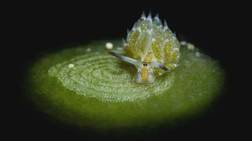 这种学名为Costasiella kuroshimae 的海蛞蝓(俗称“绵羊海蛞蝓”)能以藻类为食,并将其中的叶绿体汲取到我方的细胞内。这些叶绿体能在细胞内拿获阳光并通过光合作用制造能量,这使得海蛞蝓仿佛领有了太阳能能源。它名字的由来是其头部长着像绵羊耳朵通常的感官器官。这张相片由Giancarlo Mazarese拍摄,记载了它正在以螺旋状产卵的场景。