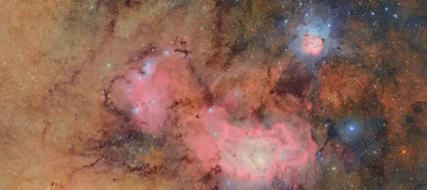 这张令东谈主感触的图像捕捉到了三叶星云(右上)和礁湖星云,它是由位于智利的薇拉·C·鲁宾天文台在 2025 年进入使用的那台3200 万像素的大家最大数码相机拍摄的数百张相片合成的。