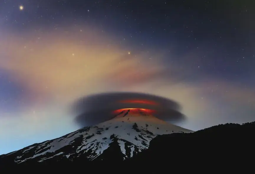 夜幕驾临开云欧洲杯app,智利比亚里卡火山喷发出的熔岩,照亮了两片非老例整的圆形云朵。这一征象由照相师Francisco Negroni捕捉,他按时赶赴该火山以监测其动作。