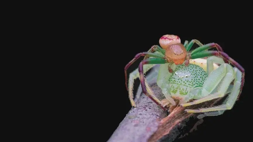 这张由当然照相师Sandip Guha在印度西里古里拍摄的、一双正在求偶的蟹蛛的相片,凸显了雄性与其良伴之间的体型相反——在某些物种中,雌性的体型比雄性大 60 倍以上。