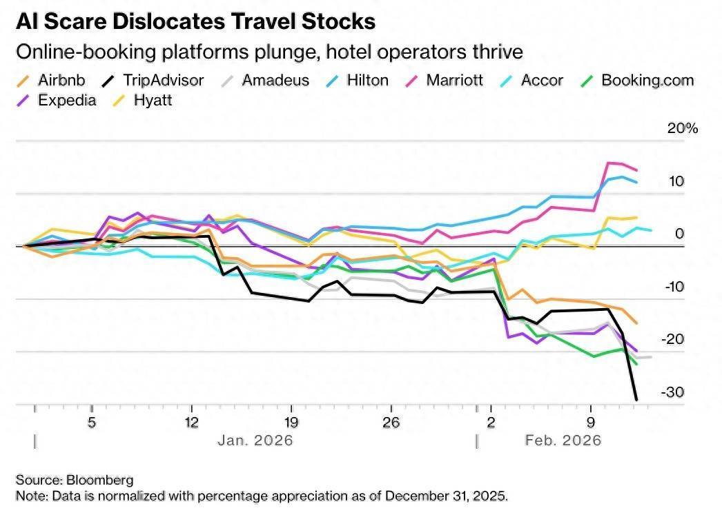 智通财经APP获悉,围绕东说念主工智能(AI)颠覆风险的担忧,在旅游与赋闲行业变成了权贵分化——在线旅游平台股价大幅下挫,而传统栈房运营商股价则强势高涨。数据流露,猫途鹰(TRIPUS)股价本年已暴跌29%,在本周财报不足预期后跌至历史最低点;Booking Holdings(BKNG.US)和Amadeus IT Group SA股价本年分散着落22%。花旗分析师还下调了对Amadeus IT Group SA的评级,称鉴于AI颠覆风险上升,展望这家欧洲旅游科技提供商“短期内难以得到昭彰答复”。与之形成昭彰对比的是,本年迄今,万豪栈房(MAR.US)股价飙升14%,希尔顿栈房(HLT.US)股价高涨12%。在希尔顿栈房2月11日发布财报后,分析师纷纷上调对其指标价。