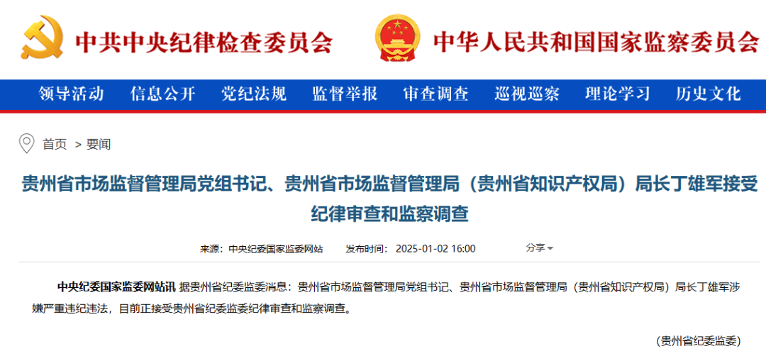 丁雄军调任贵州省市集监督惩处局党组通知、贵州省市集监督惩处局(贵州省常识产权局)局长,直至这次被查。