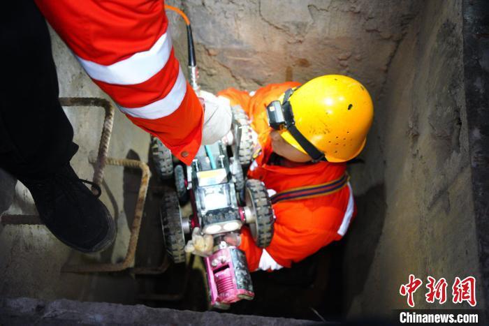 图为南铁九江桥工段瑞昌路桥养修工区功课东说念主员准备将地说念智能巡检机器东说念主参加深井内进行调查。黄钟滨 摄